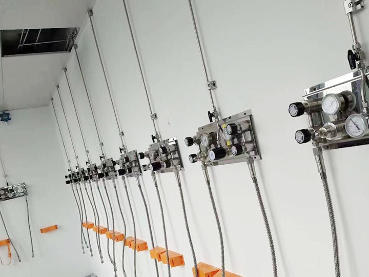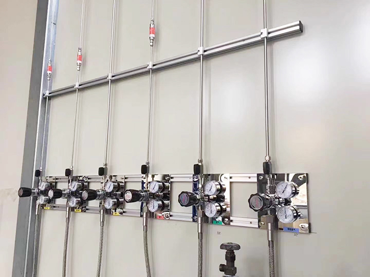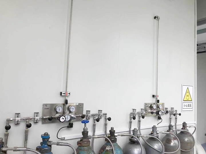 實驗室氣體采用集中供氣方式,由實驗室外專用供氣區(qū)域用管路引進。除了潔凈空氣由空氣壓縮系統(tǒng)直接產(chǎn)生外,其余氣體都是采用高壓氣瓶供氣。